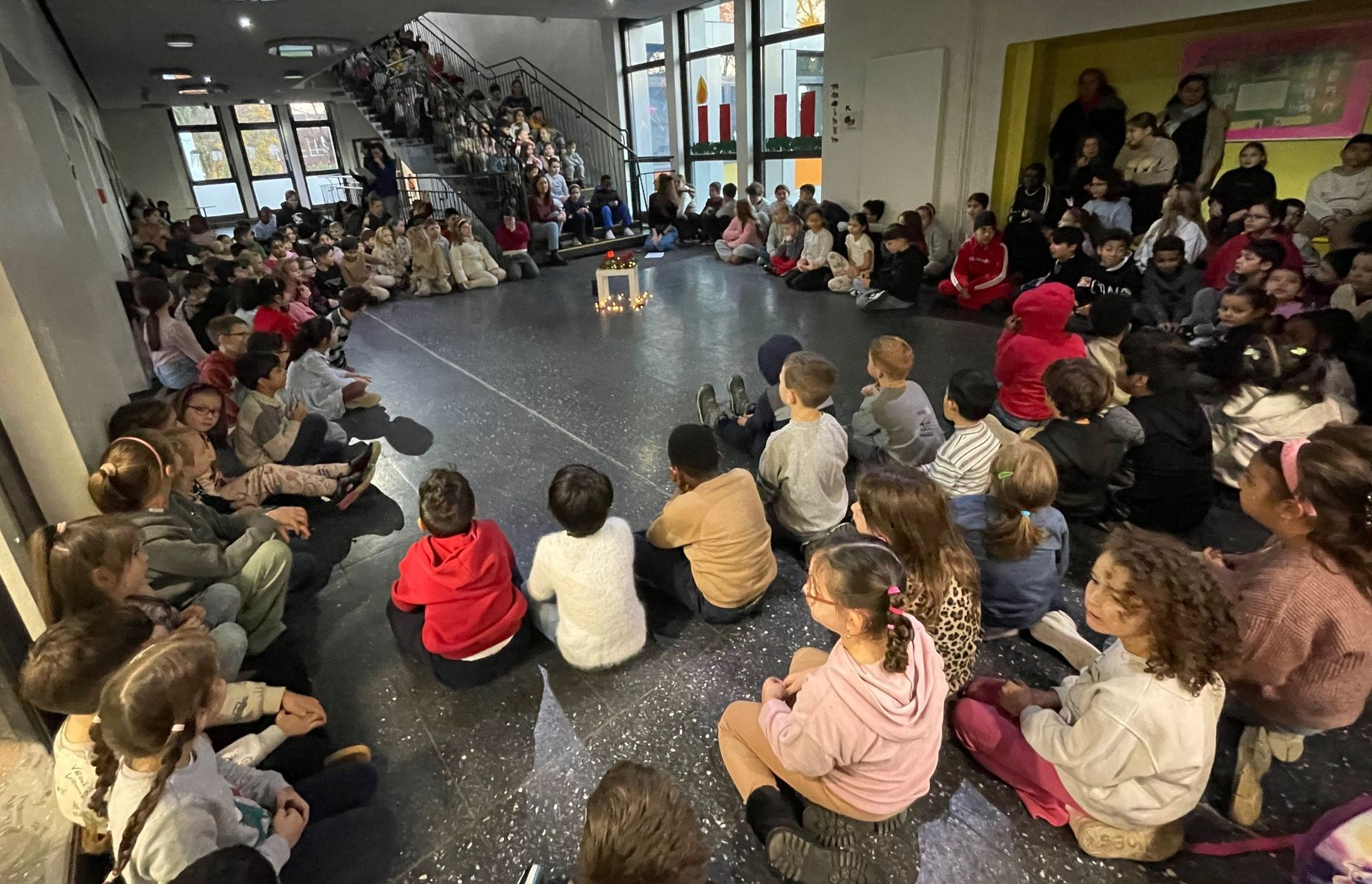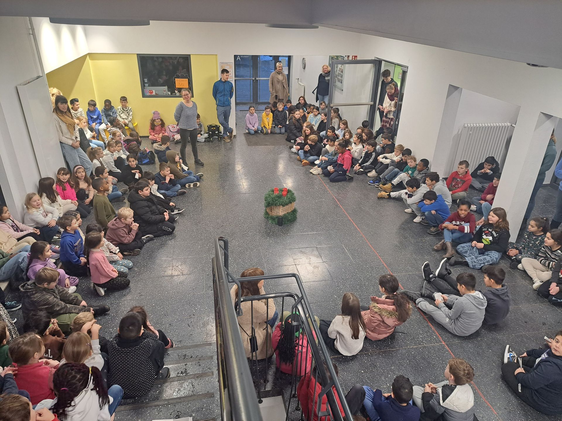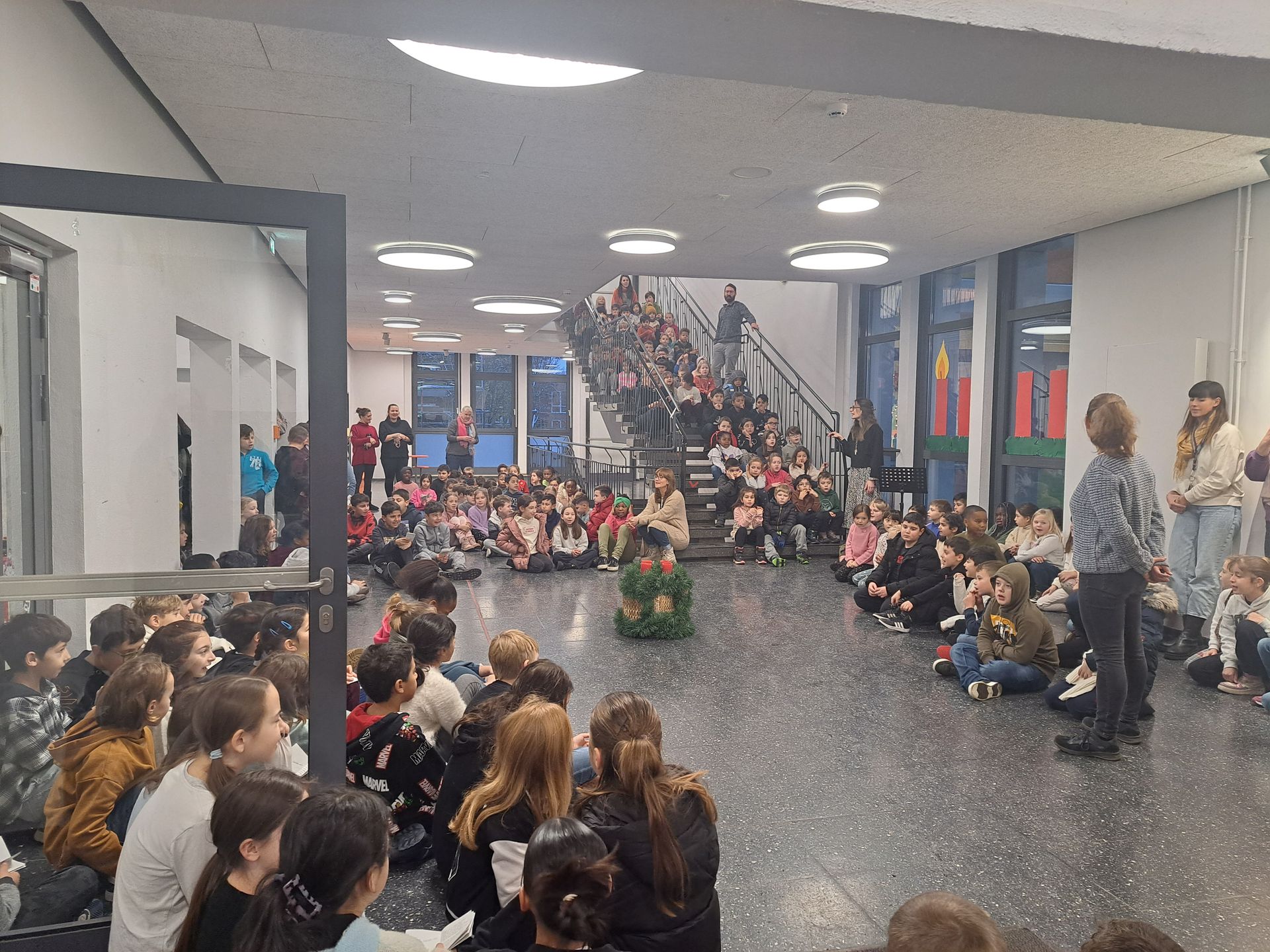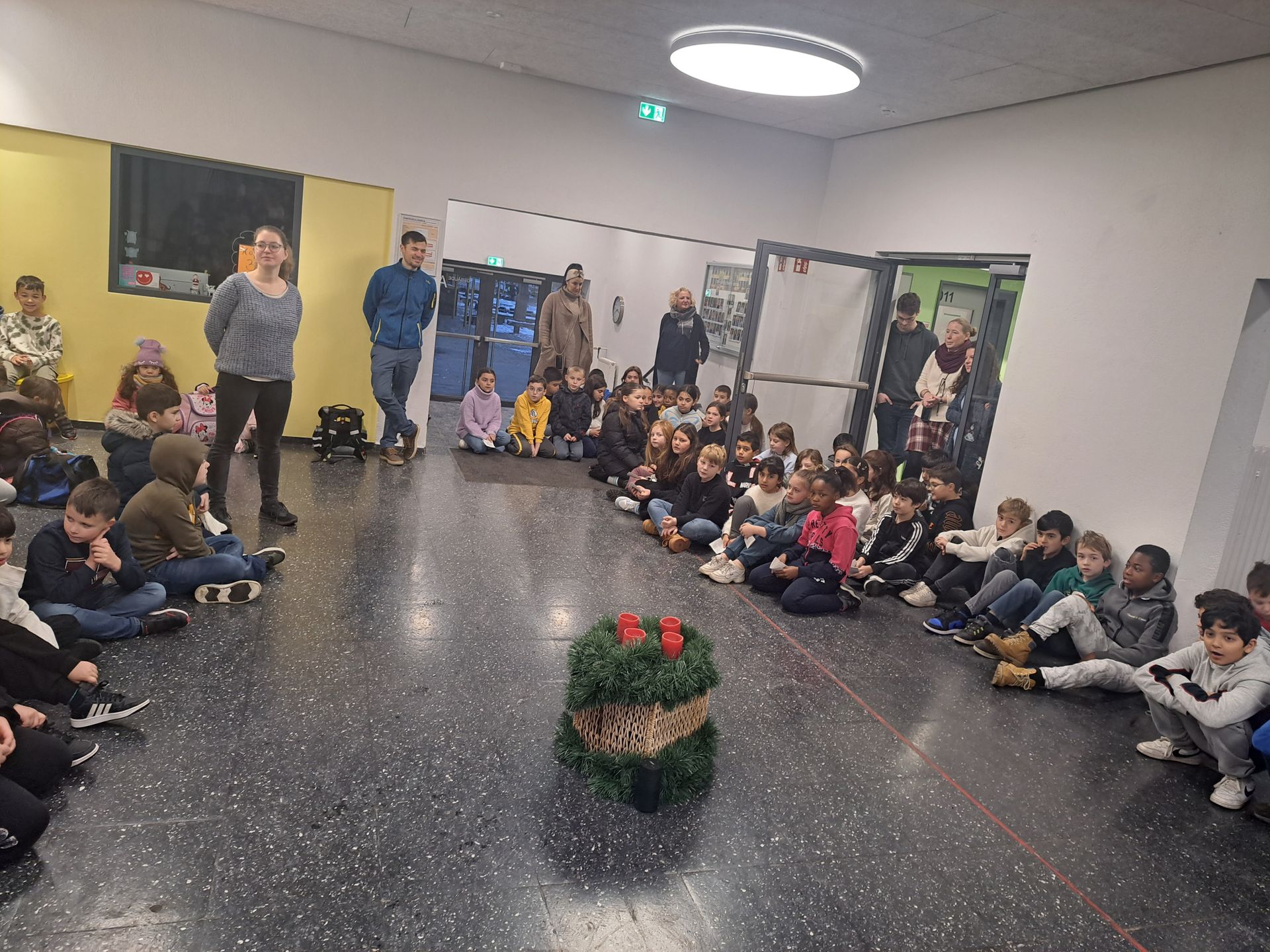 Jeden Montag nach den Adventssonntagen treffen wir uns mit allen Klassen im Foyer und singen am Adventskranz. Die Kinder haben viel Spaß, singen toll mit und freuen sich am Ende immer darauf, den Nikolaus Macarena zu tanzen.