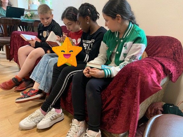 fünf Kinder der Lukas-Schule am Lesenachmittag "Mein Lieblingsbuch" im Café I-Tüpfelchen teil.