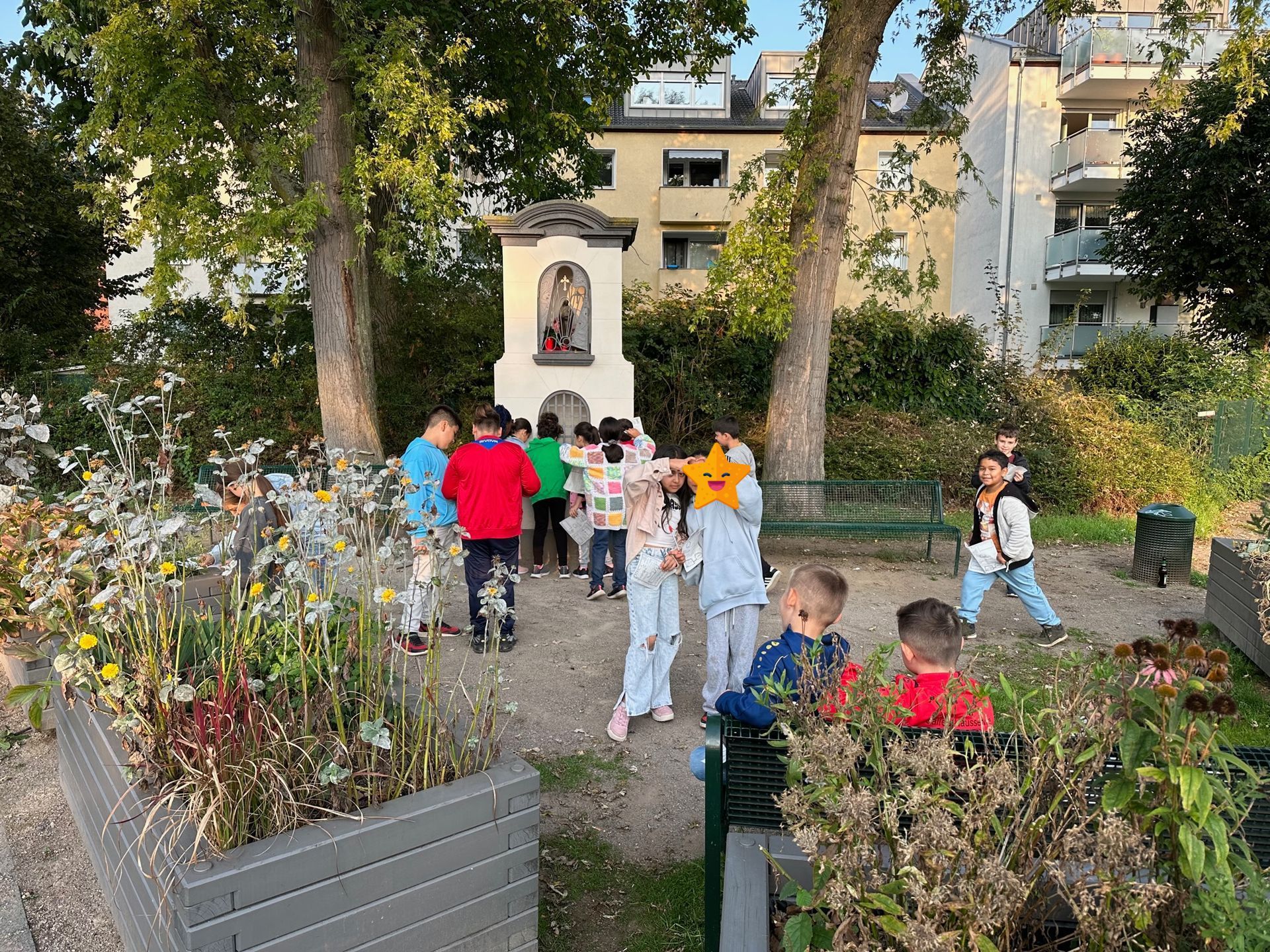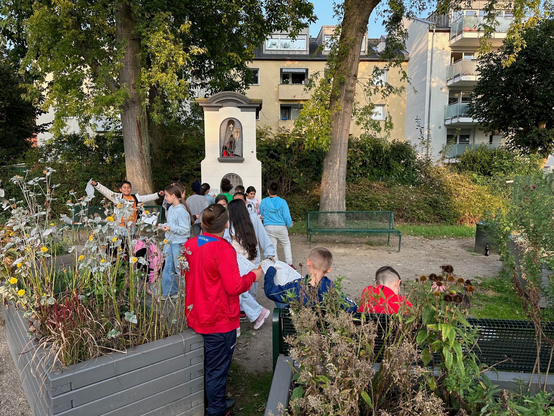 Die Kinder haben sich den Bildstock an der Kreuzung Longericher Straße/Am Bilderstöckchen angeschaut.