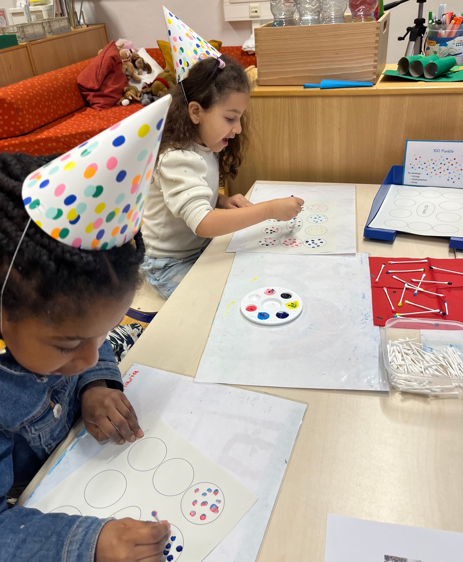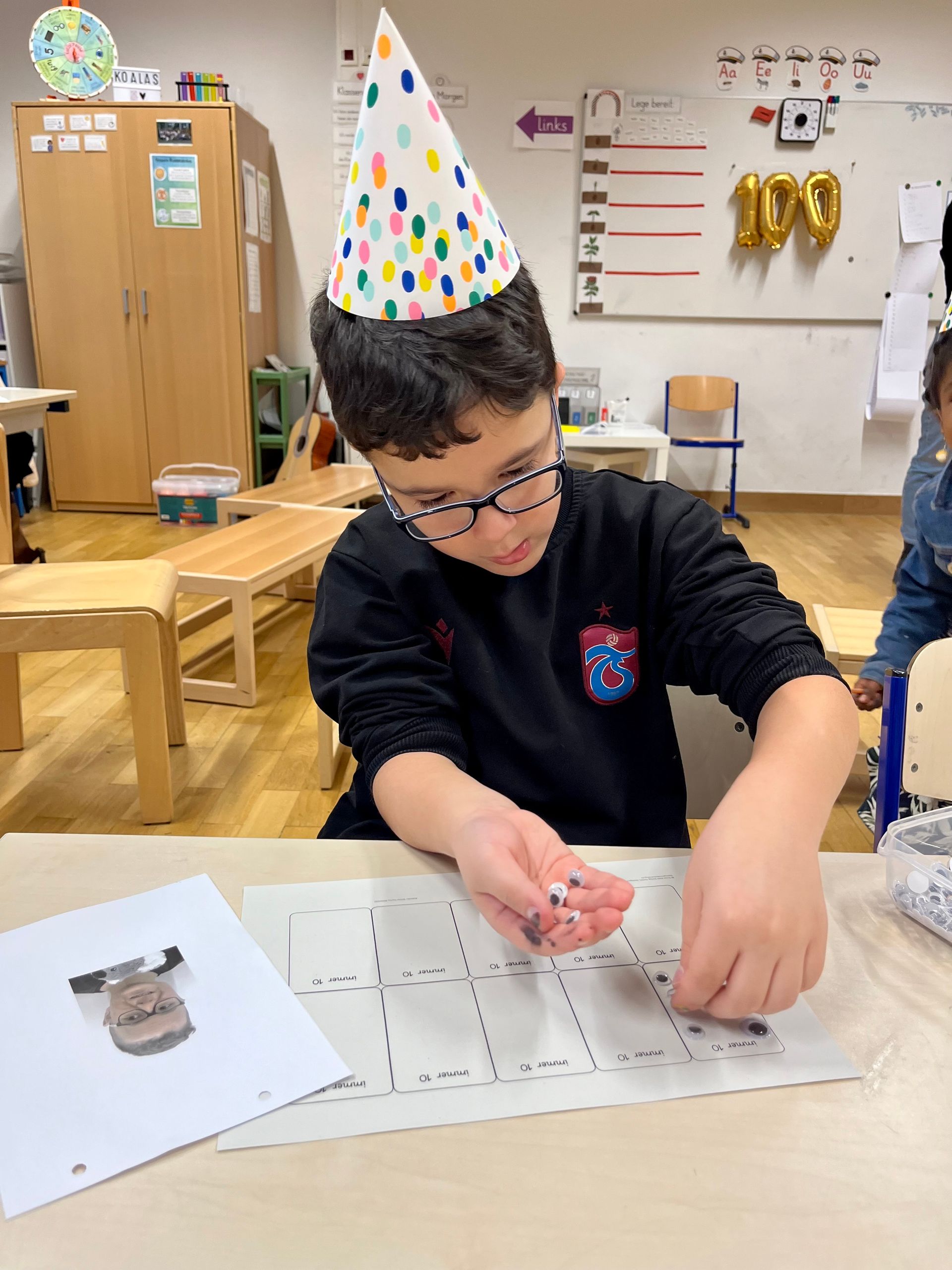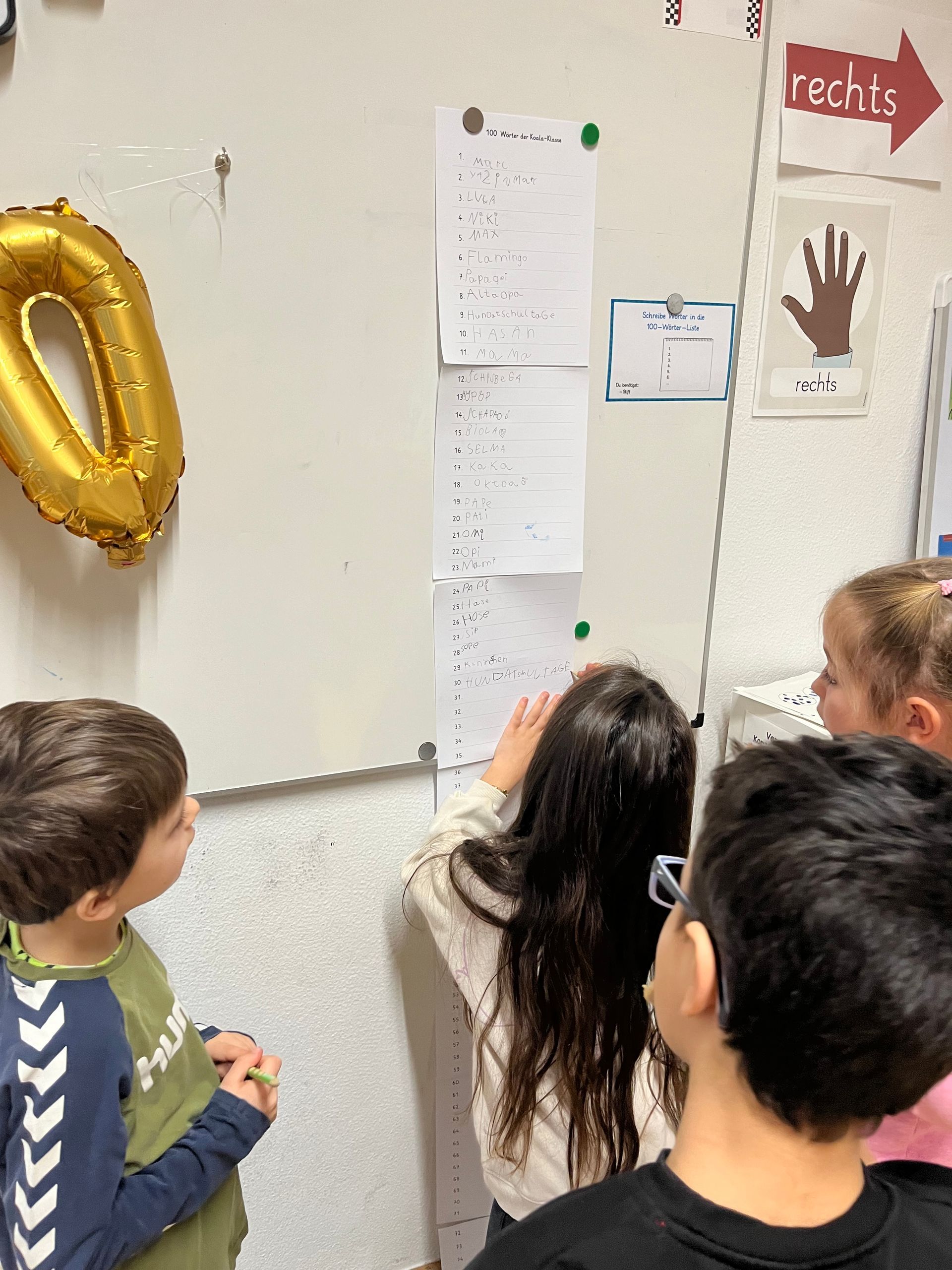 Seit der Einschulung zählten die Koalas fleißig jeden Schultag und fieberten seitdem auf den heutigen Tag (26.1.24) hin: Endlich konnten wir an unserer Schultage-Zählmaschine die 100 einstellen und feierten den Tag gebührend. An unterschiedlichen Stationen haben sich die Kinder mit der besonderen Zahl auseinander gesetzt: Es wurden 100 Buchstaben gestempelt, bis 100 gewürfelt, 100 Punkte gemalt, 100 Wörter geschrieben und 100 Dinge gelegt.